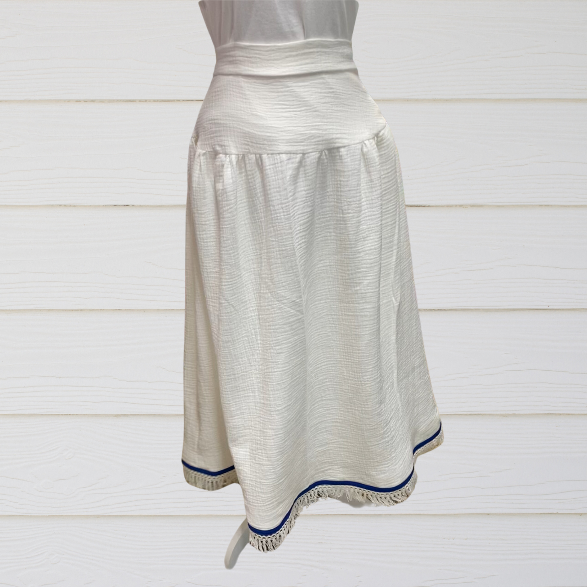All materials—skirt, fringes, blue border—are made from 100% cotton to ensure Torah compliance. Soft, breathable, and comfortable, this garment is designed with care and quality. These skirts are designed to be mid-calf length but can be customized upon request. You will need a slip to wear under for modesty.