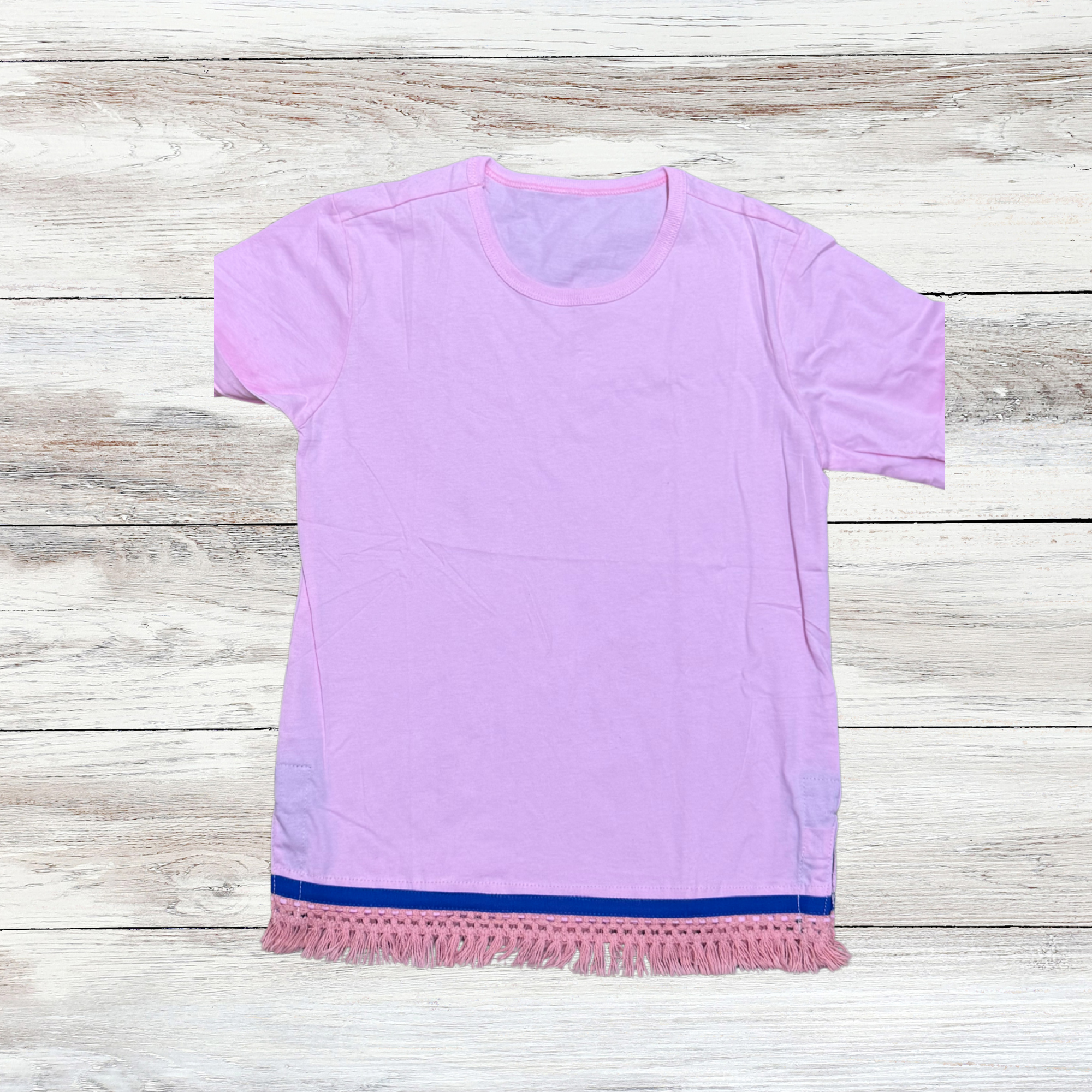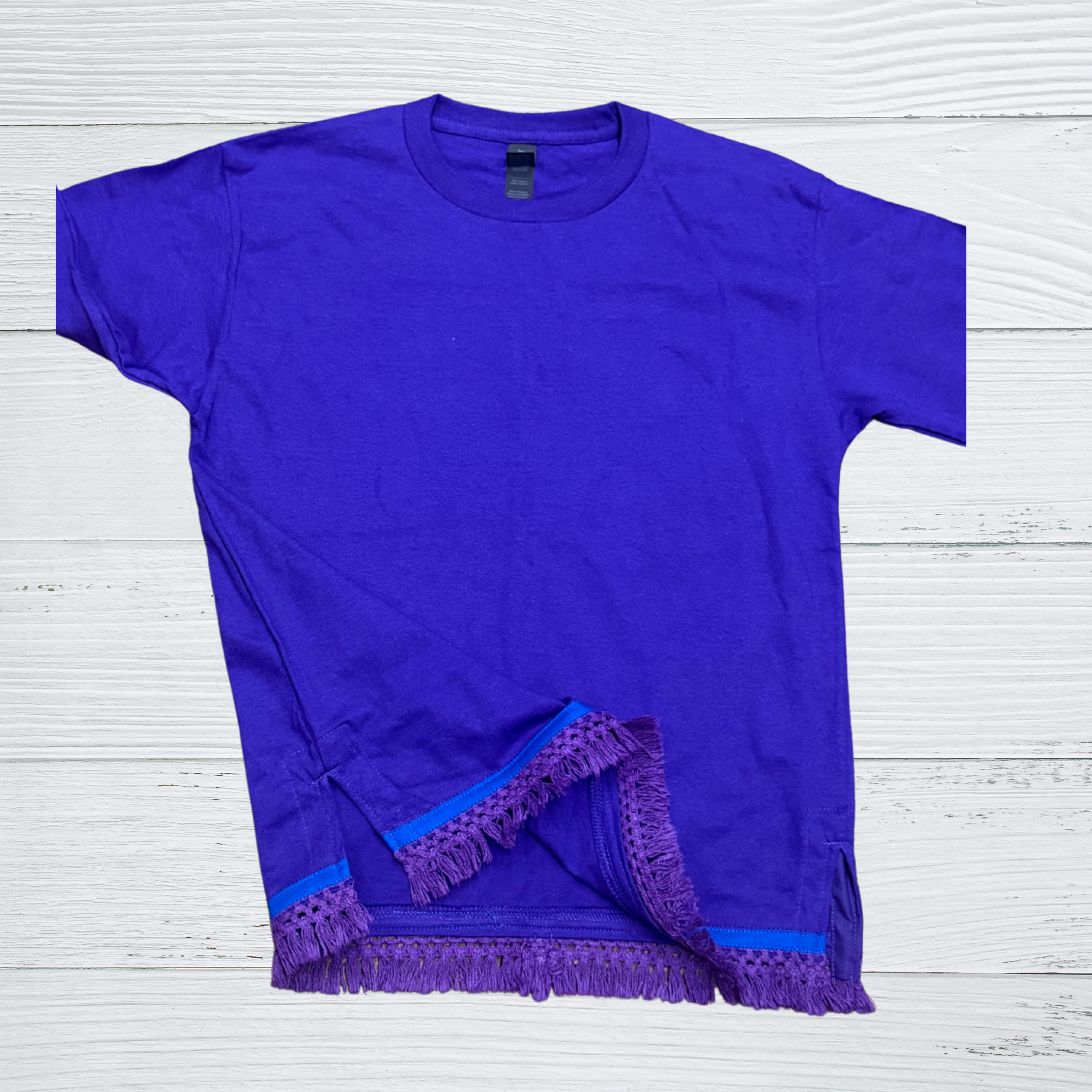 Youth Crew Neck Girls Shirt – 100% Cotton, this shirt offers a perfect balance of softness and breathability while keeping kids cozy and comfortable. Designed with elegant fringes and finished with a beautiful royal blue border, it blends everyday wearability with a touch of style. Our shirts feature thoughtfully crafted slits on the sides for easy on and off, and comfortable wear. Fringes will match color of the shirt.