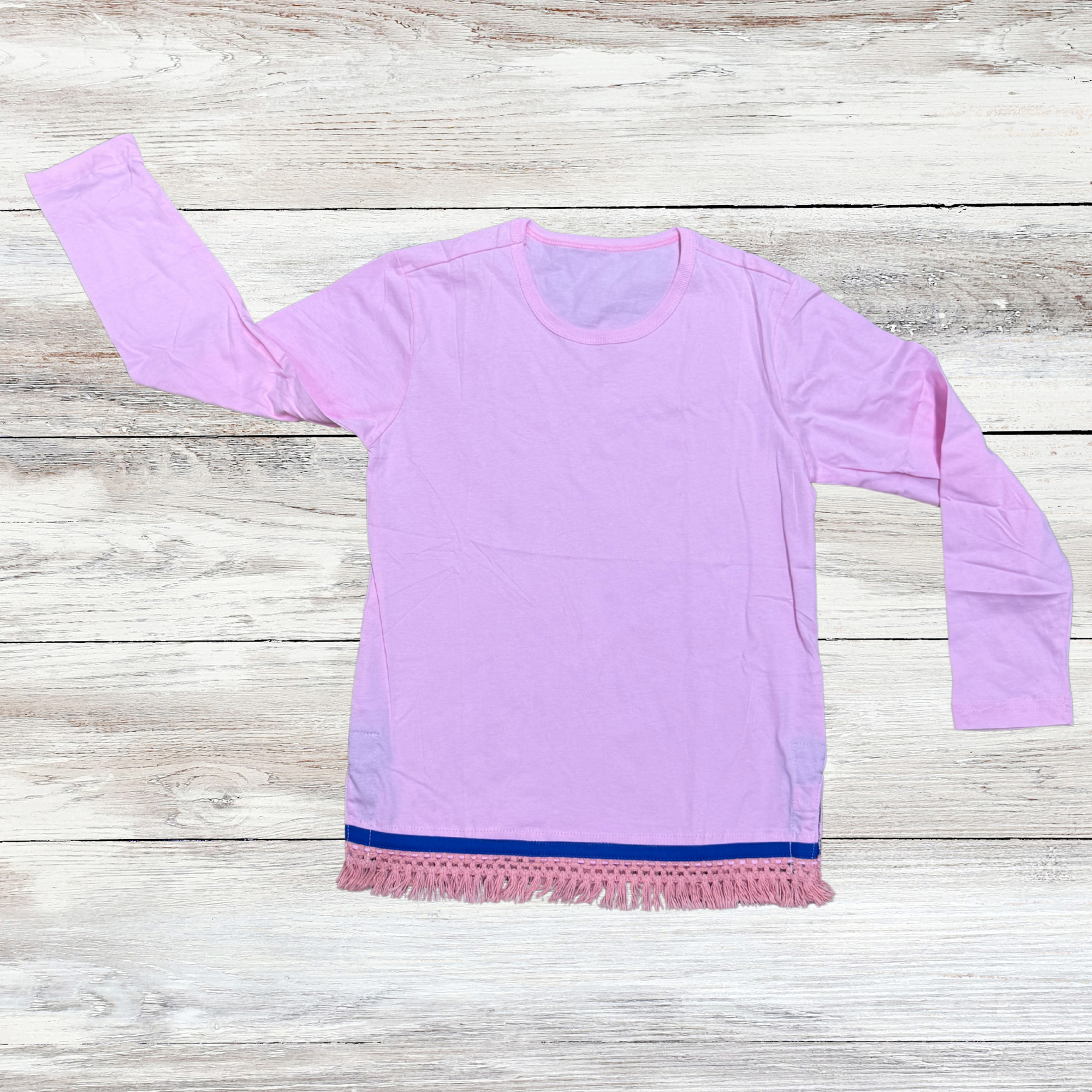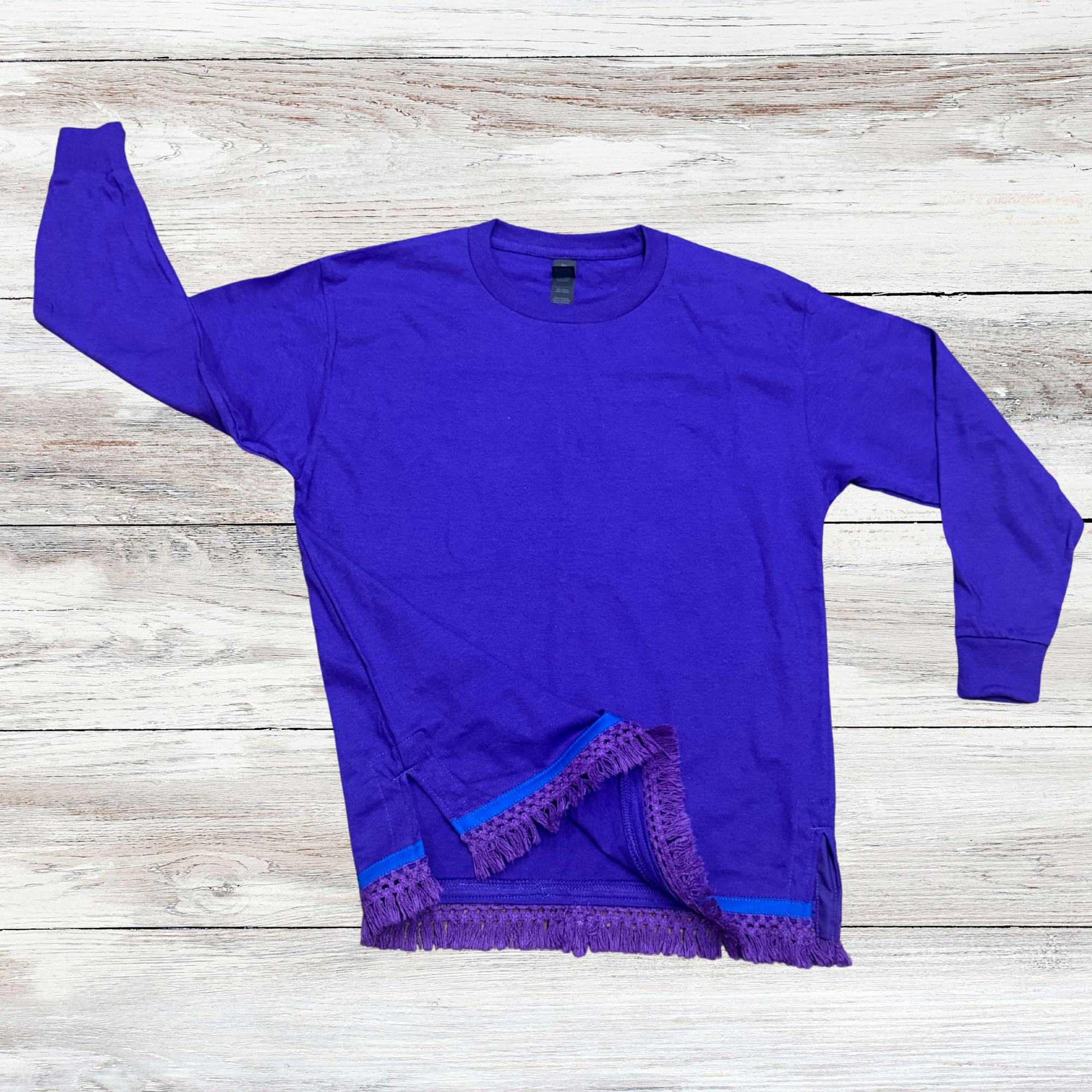 Step into timeless style with this women’s long sleeve shirt, crafted from 100% breathable cotton for a soft, comfortable feel that lasts all day. Featuring a classic crewneck design, this piece is elevated by delicate fringes and a beautiful royal blue border, adding movement and elegance to every step. Whether worn casually or dressed up with accessories, it’s a versatile staple that blends tradition with modern flair—perfect for those who value comfort, individuality, and standout detail. Fringes will match shirt color and border will be royal blue. Royal blue border and fringes are also 100% cotton.